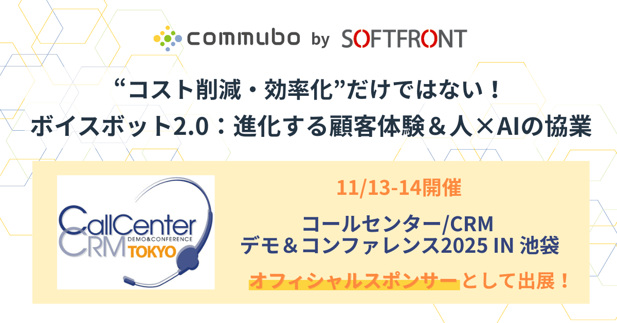 ソフトフロント、コールセンター/CRM デモ&コンファレンス2025 in 池袋にオフィシャルスポンサーとして出展 “コスト削減・効率化”だけではない! ボイスボット2.0:進化する顧客体験&人×AIの協業