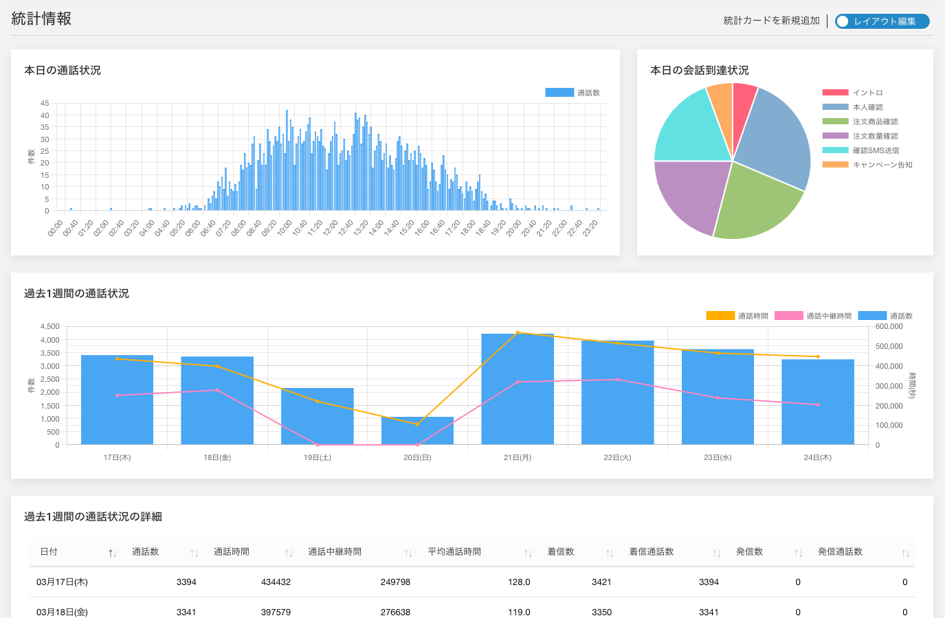 ・ダッシュボードの会話統計機能:着信数、平均通話時間などがグラフ・表化でき、日々の運用状況を簡単に確認